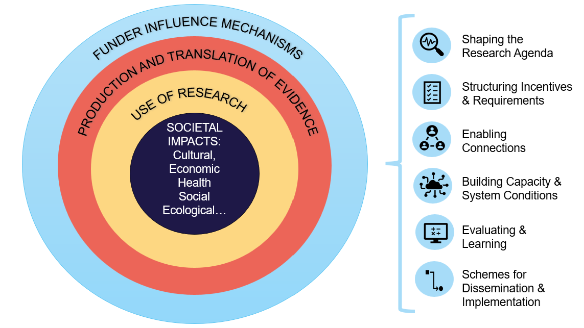 Figure 1: Funders don’t just decide what gets researched; they also shape how research is conducted, translated, and used. These influence mechanisms, from setting agendas to supporting dissemination, can play a powerful role in determining whether research has a societal impact.