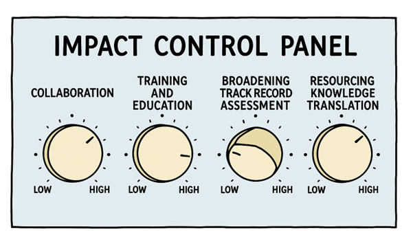 Illustration 1. Funders have an ‘impact control panel’ with dials they can turn up or down. Each knob represents one influence mechanism and the ‘hidden power’ they hold. Image designed using ChatGPT.